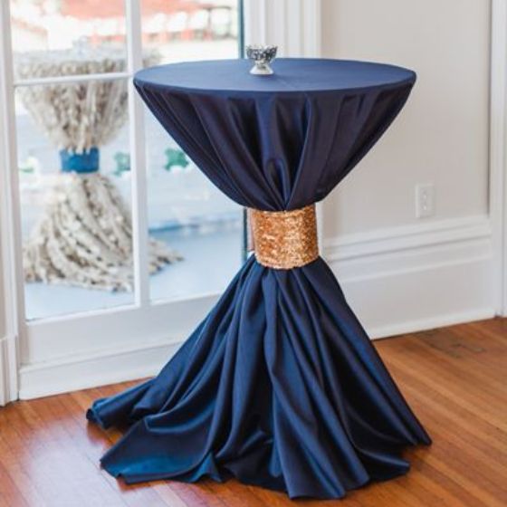 Cocktail tables can be enhanced with fitted covers, ribbons, floral arrangements, and LED lighting to match the wedding theme.